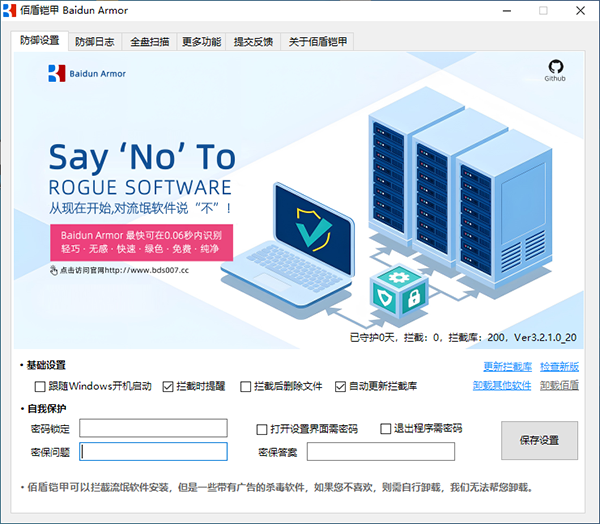 佰盾铠甲(Baidun Armor)是一款永久免费的流氓软件免疫工具,它能够有效地帮助用户一键屏蔽和免疫各种烦人的流氓软件以及弹窗广告。通过使用佰盾铠甲流氓软件拦截软件,你可以彻底告别因这些不必要的程序导致的电脑卡顿问题,让你的Windows系统恢复其应有的纯净与流畅。软件简单易用、功能实用且界面清爽。