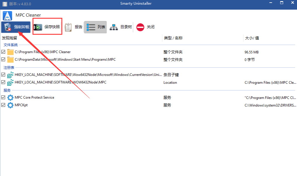 3、点击左上角的强制删除选项即可删除,上方还可以保存当前快照。