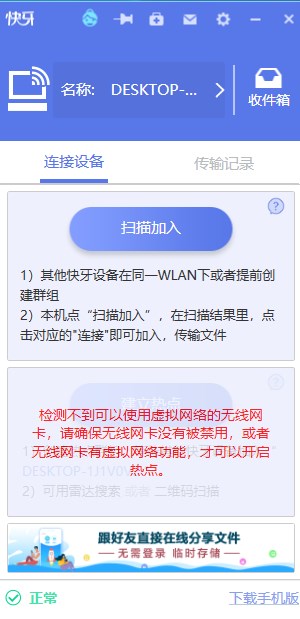 使用快牙时如遇到“无法启动热点”的问题,我们可以先检查无线网卡是否正常开启,由于“快牙电脑版”支持虚拟WiFi创建,所以可多次尝试重启“快牙电脑版”创建连接状态。还有注意查看是否安装了其它热点软件,可删除之后再试。 注: 1. 电脑内必须有无线网卡硬件才可创建虚拟WiFi状态,如未有无线网卡,但电脑和手机在同WiFi环境内也可连接 2. 与“快牙电脑版”相同产品会出现冲撞程序,有可能导致无法正常创建热点软件电脑版打不开
