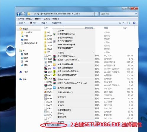 在win7 64位安装fortran,需要注意,应该点击文件包中的《x86》文件下的“SETUPX86.EXE”。第一步:打开安装文件包中的《x86》文件下的“SETUPX86.EXE”右键,选择属性。