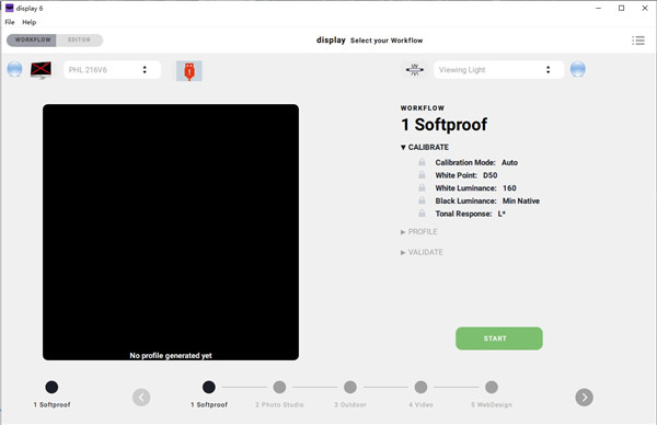 主窗口,您可以通过选择预定义的工作流程并按下按钮来启动校准,配置文件和其他功能。 本软件会记住您已经执行了哪些工作流程。您可以通过选择相关项目并单击来加载相应的校准,包括基于硬件的查找表(LUT)和关联的文件,而无需再次进行校准。根据显示器型号的不同,激活新的校准将花费几秒钟的时间,但所需时间不及全新的校准/配置文件的时间。