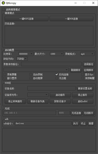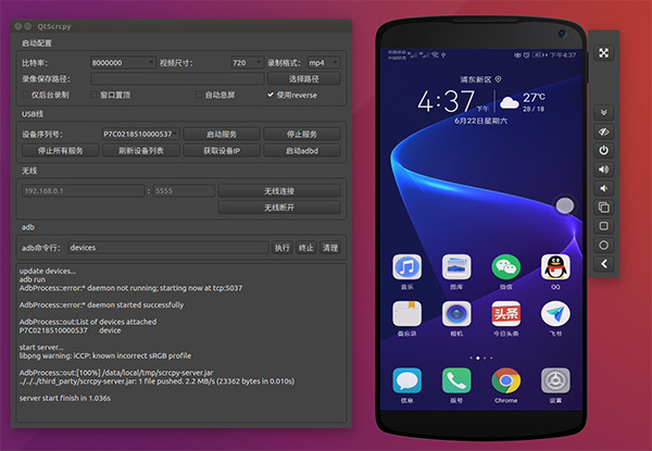 1、QtScrcpy可以通过USB(或通过TCP/IP)连接Android设备,并进行显示和控制。不需要root权限。 2、单个应用程序最多支持16个安卓设备同时连接。 3、同时支持GNU/Linux,Windows和MacOS三大主流桌面平台 4、它专注于: 5、精致 (仅显示设备屏幕) 6、性能 (30~60fps) 7、质量 (1920×1080以上) 8、低延迟 (35~70ms) 9、快速启动 (1s内就可以看到第一帧图像) 10、非侵入性 (不在设备上安装任何软件)qtscrcpy使用教程