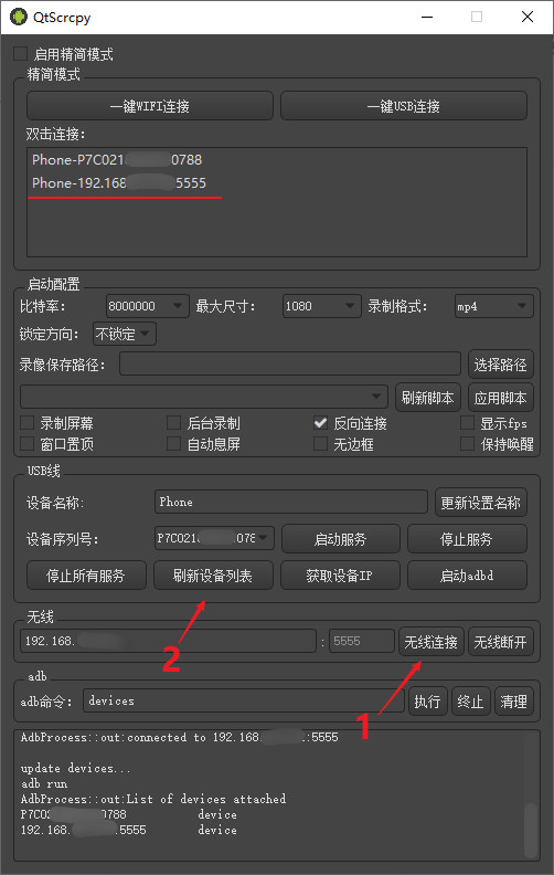 1、无线连接就有些麻烦了,首先依旧是安卓手机端在开发者选项中打开usb调试,并通过usb连接安卓手机到电脑 点击刷新设备,会看到有设备号更新出来,点击获取设备IP,点击启动adbd