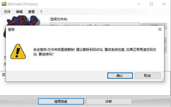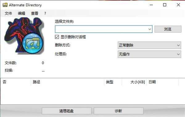 Alternate Directory免费版(强制磁盘文件删除工具)是一款十分出色的强制磁盘文件删除工具,软件可以强制删除文件夹,将里面保存的数据以及进程删除,从而释放磁盘空间,这款软件操作还是很简单的,可以直接在软件界面选择一个文件夹删除,可以选择将删除的内容保存到回收站,方便您以后将该文件夹恢复。Alternate Directory免费版提供了清理硬盘磁盘、诊断磁盘两大功能,可以轻松的删除磁盘中的无用文件释放磁盘空间,另外有时候我们移动或删除一个文件的时候,系统会提示当前文件正在使用中,无法直接删除,该软件就可以强制删除它;Alternate Directory免费版可以轻松的删除磁盘中的无用文件释放磁盘空间,还能支持用户自定义添加或删除文件类型,用户可以在选项菜单中找到你要扩展或限制不必要的文件列表,有兴趣的小伙伴快来下载体验吧!