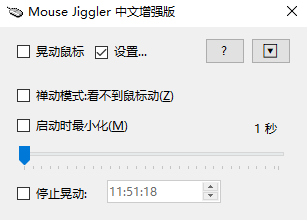 “禅动模式”,指针会“虚拟”抖动 – 系统认为它在移动,因此防止屏保激活等,但指针实际上并未移动。然而,这可能不适用于一些选择实现自己的空闲检测的应用程序。“停止晃动”, 勾选后会允许调节晃动停止的时间。比单纯的命令行参数结合任务计划更方便好用。 要将 Mouse Jiggler 最小化到通知区域,请单击向下箭头按钮。