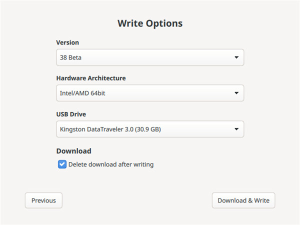 专为 Fedora 设计:专为 Fedora 发行版量身打造,在创建 Fedora 的 Live USB 时具有高度兼容性和顺畅的体验。 用户界面友好:界面简单直观,非常适合对技术不熟悉或第一次制作 Live USB 的用户。 自动下载 Fedora:能够直接下载最新版本的 Fedora Workstation 或 Fedora Spins,无需提前准备 ISO 文件。 支持不同的 Fedora 版本:支持各种 Fedora 版本,包括 Workstation、Server 以及不同的 Spins(如 KDE、XFCE 等)。 镜像文件验证:能够自动验证 Fedora 镜像的完整性和真实性,确保文件未被损坏且安全可靠。 多平台支持:Fedora Media Writer 可在多种操作系统上运行,包括 Windows、macOS 和 Linux。 更新简便:如果您已经安装了 Fedora,Fedora Media Writer 可创建一个适用于最新版本的引导 U 盘,从而简化升级过程。使用方法