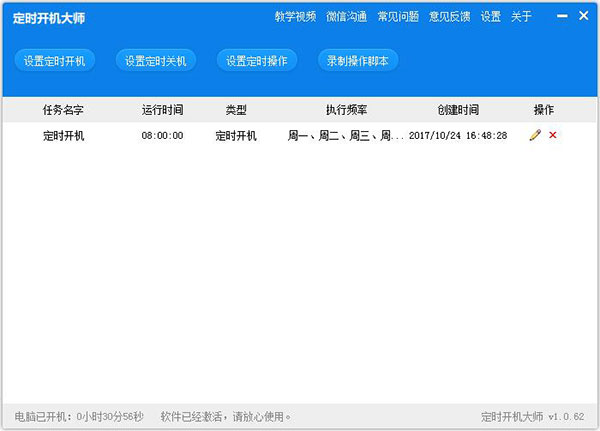 定时开机任务是定时开机大师软件最基础的功能,使用定时开机任务,可以使您的电脑在任意时间点以任意频率自动开机。
