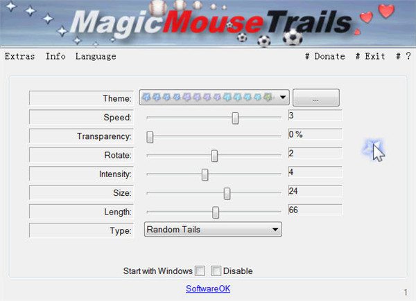MagicMouseTrails绿色版是一款鼠标拖尾自定义辅助工具,软件能够可以和帮助我们对鼠标的自定义做到很好的辅助,并且还可以自己调节大小和速度的转换;MagicMouseTrails绿色版可以让你在移动鼠标的时候显示痕迹特效,例如你可以设置雪花特效,当你在桌面移动鼠标的时候就会有雪花效果,例如你选择树叶当移动鼠标的时候就会有树叶痕迹,让你在使用鼠标的时候获得更多特效,让鼠标的痕迹更加清晰,对于需要设置鼠标移动痕迹特效的朋友很适合;MagicMouseTrails绿色版拥有多种效果可以选择,用户可以通过自己的我需求来进行设置,能够自由调节速度及大小、透明度等等多种功能,这样可以让用户在使用鼠标的过程中多了一些乐趣,能够进行多种自定义效果,有兴趣的小伙伴快来下载体验吧!