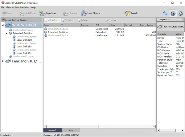 1、打开active uneraser,然后在特定硬盘驱动器或USB磁盘下的“本地系统设备”列表中,选择要扫描的卷(逻辑磁盘)以查找已删除的文件,或者选择要扫描的未分配空间以查找已删除的分区