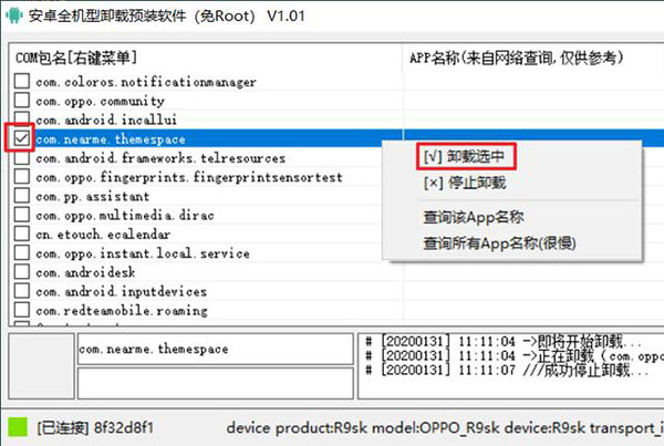5、找到你想要卸载的预装软件,点击包名前面的勾选框,然后右击卸载选中即可成功卸载该预装软件。