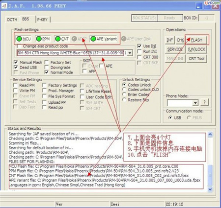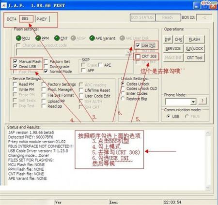 1、打开J.A.F1.98.66刷机工具,然后按照教程中的编号顺序勾选进行刷机。(提示:WIN7系统需要开启管理员权限和兼容模式,WIN7的系统—右键属性—兼容性—管理员模式—兼容模式)