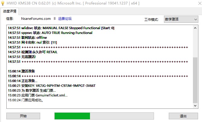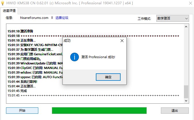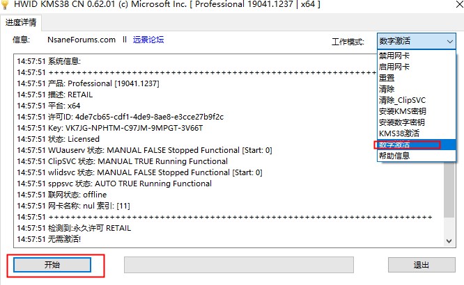 2、单击工作模式的下拉框--找到并单击 “数字激活”--单击左下角的 “开始”按钮;