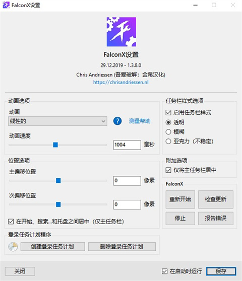 FalconX中文版是一款小巧轻便的电脑美化软件。使您可以控制任务栏图标的位置,将带给您原始的Windows Dock感觉。当您从任务栏添加或删除图标时,图标将移动到中心或用户所指定的位置。您也可以选择在各种不同的动画之间进行选择并更改其速度。如果您不喜欢动画并希望它们立即移动,则可以禁用动画。也可以更改中心位置,以根据中心位置将图标更多地移到左侧或右侧。FalconX中文版支持多种任务栏样式设置,包括垂直任务栏和无限任务栏。您还可以将任务栏显示状态更改为“透明”、“模糊”和“亚克力”。如果您想在电脑启动时运行:要使软件在启动时运行,您必须打开“FalconXSettings_chs” 在启动时运行,然后点击“应用”按钮,这样软件就会开机自启动了。感兴趣的小伙伴可以下载体验!