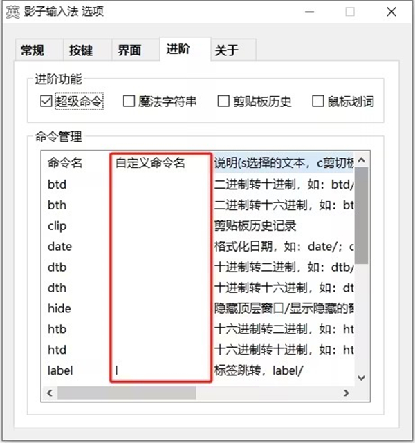 3、超级命令:这个功能我这个输入法的核心所在,内置了多种常用命令,命令也可以自定义,让工具使用快速高效,这也是取名影子的原因。
