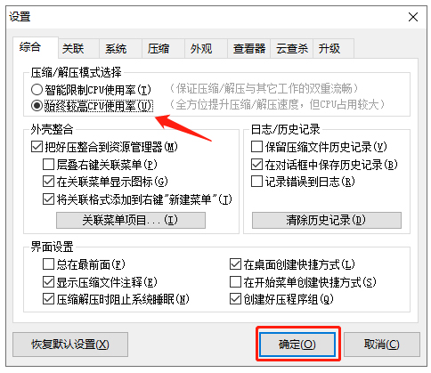 1、如何加快压缩解压速度? 在压缩解压时,点击界面中的【智能限制CPU使用率】按钮,切换为【始终最高CPU使用率】能够一定程度上提高压缩解压速度,缺点是CPU使用率较高。