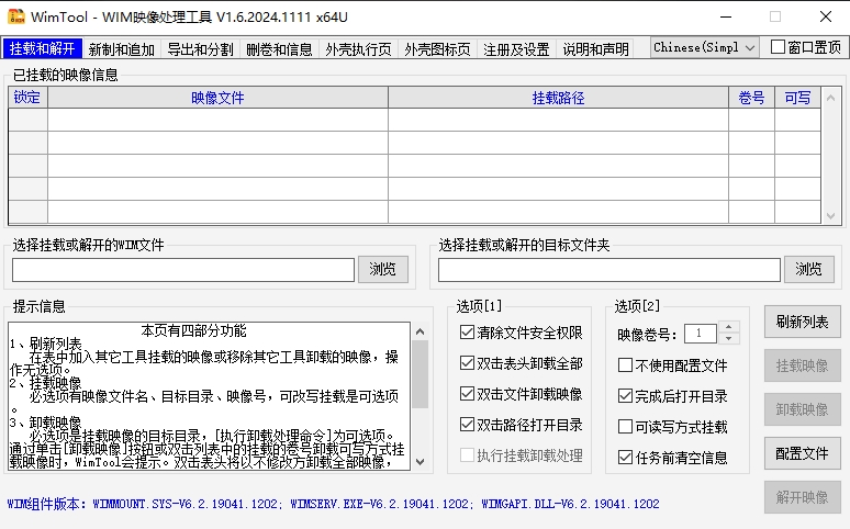 WimTool中文版是一款功能齐全、操作简易的win映像处理工具。它能为普通用户提供对.wim格式文件最常用的处理功能,如制作映像文件、挂载映像、解开Wim映像到硬盘的目录和向现存的Wim文件加入新的映像卷等。