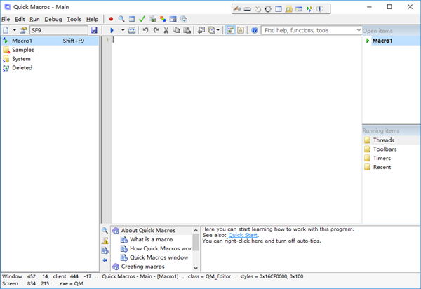 Quick Macros是一款功能强大的自动化工具和宏脚本软件,它允许用户创建和执行各种自定义宏脚本,以简化日常计算机任务和提高工作效率。使用Quick Macros,你可以录制鼠标和键盘操作,并将其保存为宏脚本。这些宏脚本可以用于自动执行重复性任务,如自动化表单填写、数据处理、文本操作、窗口管理等。你还可以编写自定义的脚本代码,进行更高级的逻辑和操作。