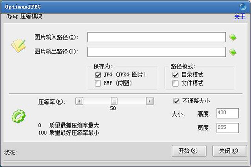 OptimumJPEG是一款实用的图片压缩工具软件,软件操作非常简单,只需要几个简单的步骤就可以,不仅支持快速压缩图片JPEG以及BMP文件,还能够对图片进行自定义设置,修改图片的尺寸,速度非常快,能够提高用户的工作效率。使用该软件压缩,不会对图片造成损坏,高品质的压缩方式,支持批量将jpg图片转换成具有统一压缩率和大小的图片,压缩率决定了图片大小和质量,以通过拖动压缩条设置图片的压缩比例可以随时任意修改,没有固定的尺寸比利限制。在添加图片时,可以直接将图片所在的文件夹直接添加在软件的界面,让你操作更方便。有需要的用户欢迎下载体验!