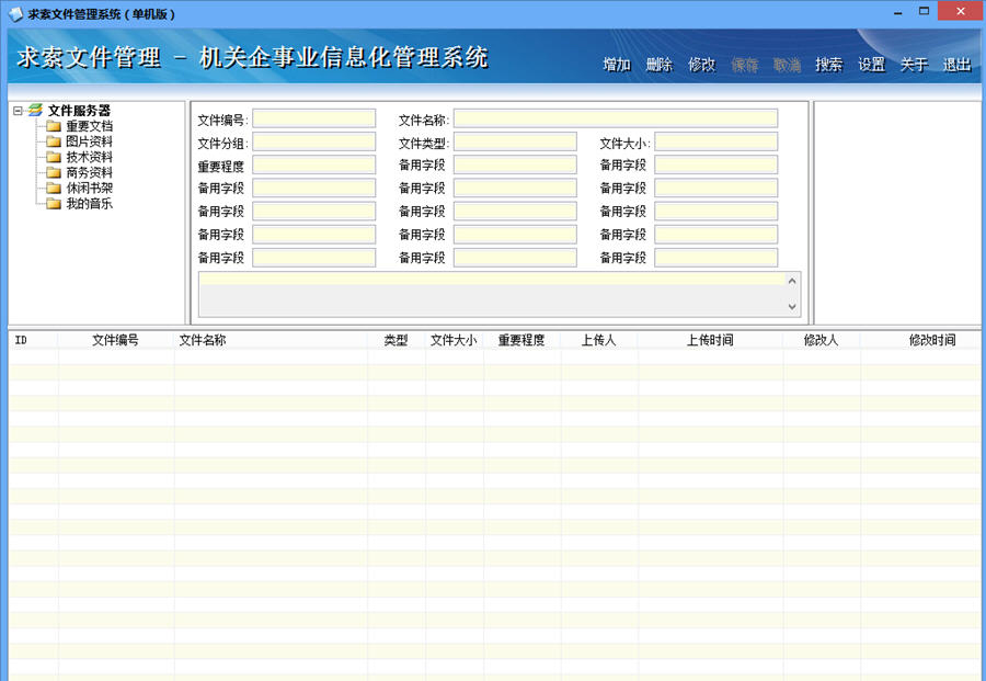 本次小编介绍的是一款专门针对数据库存储技术和电子信息文件的集中管理的软件,求索文件管理系统官方版这款软件采用了最先进的分布式数据库存储技术,支持任何格式的电子信息文件管理,是企业管理化管理、信息化建设的最佳软件之一,主要适用于各行业海量的办公文件管理、设计图纸管理、机密文档管理、私密照片管理、音像资料管理、媒体资源管理。信息安全,方便管理,此款软件安全无毒,请放心下载。求索文件管理系统这款软件能够有效提高人员工作效率和文件利用率.求索文件管理系统是机关企事业单位文档管理,信息化建设的首选产品之一!喜欢这款软件快来下载吧!
