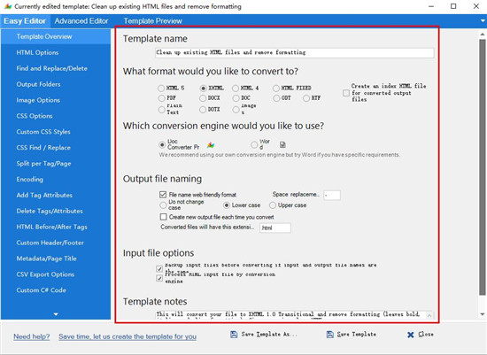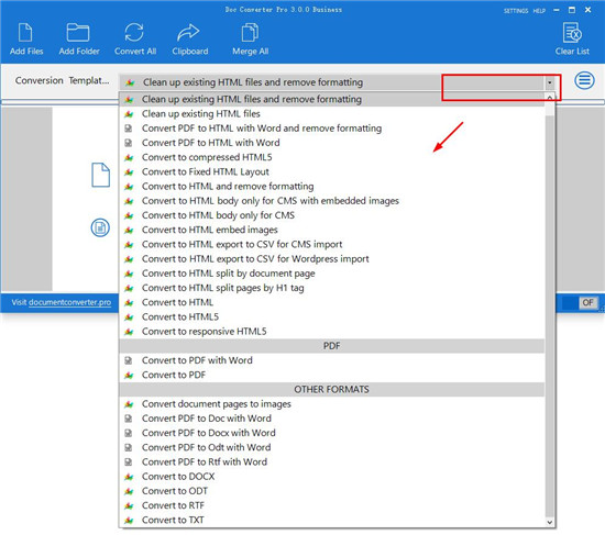 Doc Converter Pro是一款非常专业好用的PC端文档格式转换工具应用,主要针对需要经常更新带有文本内容网站的Web管理和设计等办公人员群体使用。软件占用内容小巧,界面简洁友好,且安装操作简单易上手,不仅为广大用户提供了多样化的文件格式转换功能,例如将Word (DOCX或DOC)转换为HTML、Word转换为PDF、PDF转换为HTML等,还可以帮助用户将doc转换与输出为html、html5、rtf、txt、odt等多种输出格式,具有着简便、快速、灵活以及可定制等一系列特色优势,从而帮助你可以更好的节省时间,提高工作流程效率。除此之外,与市面中同类型软件相比较而言,全新Doc Converter Pro除了必备的专业转换功能以外,还内置了多种强大的格式编辑器模式供用户自由选择使用,例如在将doc转换为html时,完成对HTML选项、查找和替换/删除、图片选项、CSS选项、自定义CSS样式、自定义页眉/页脚、元数据/页面标题等参数进行全面的配置,,并且还支持优化网页的大小,与使用Microsoft审查的应用程序保存的HTML文件相比,其大小最多可缩小高达70%。以此让您获得最佳的输出转换结果!