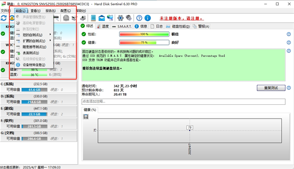 硬盘哨兵专业版(Hard Disk Sentinel Pro)是一款专业的多系统硬盘/SSD监控分析工具,能够全面检测磁盘健康状态、性能表现及温度等关键参数(包括 S.M.A.R.T.值),并提供敏感的健康评级系统和数据保护方案,有效预防硬盘故障和数据丢失。