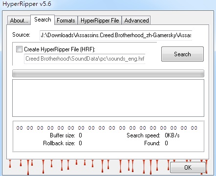 4、然后切换到search选项卡,在source一栏中,点右边那个省略号按钮,选择你要解包的pck文件,这里我们选另外一个文件试试,就那个sounds_eng.pck,用来提取E叔的声音,完成后,点击search,就又开始刷刷刷的扫描了