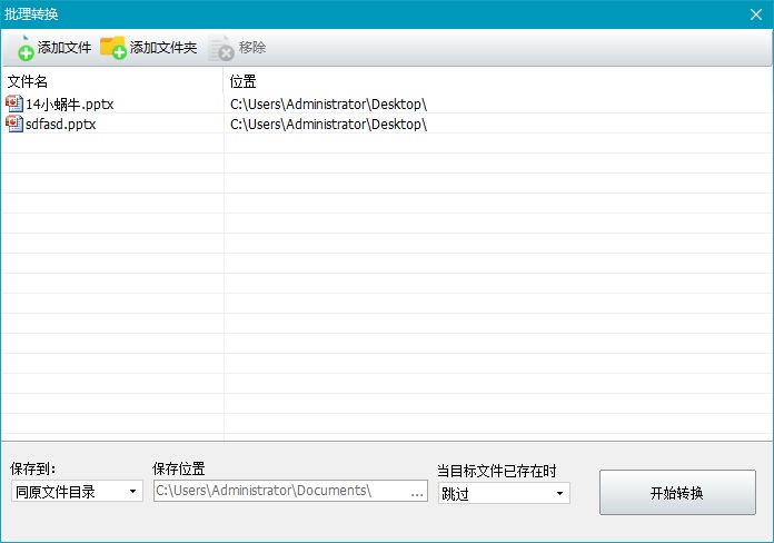 3. 在这个批量转换窗口里,可以添加多个PPT文件,设置好保存位置等相关选项后,点击右下角“开始转换”按钮,即可以一键将所有的PPT文件转换为PDF文件了。