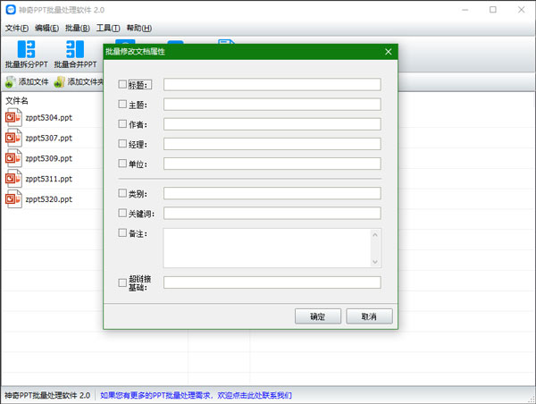 导入PPT文件后,点击“修改文档属性”按钮,设置并勾选需要修改的属性及内容,点击确定即开始批量处理PPT文件,如下图所示: