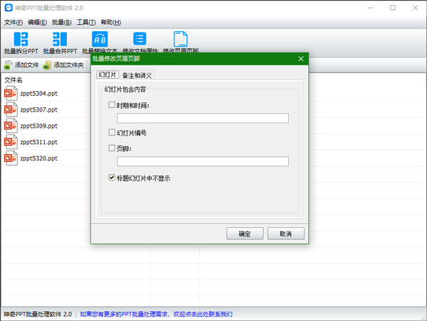 导入PPT文件后,点击“修改页眉页脚”按钮,设置页眉页脚内容,点击确定即开始批量处理PPT文件,如下图所示: