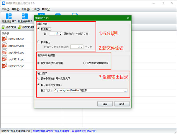 1、批量拆分PPT功能 导入PPT文件后,点击“批量拆分PPT”按钮,设置拆分规则、新文件命名规则、输出目录,点击确定即开始批量处理PPT文件,如下图所示: