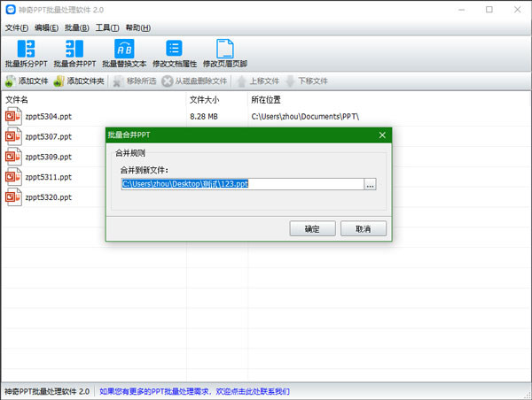 导入PPT文件后,点击“批量合并PPT”按钮,设置合并后的新文件保存目录,点击确定即开始批量处理PPT文件,如下图所示: