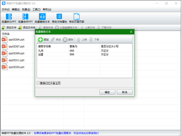 导入PPT文件后,点击“批量替换文本”按钮,设置需要替换的字符串和替换后的字符串,点击确定即开始批量处理PPT文件,如下图所示: