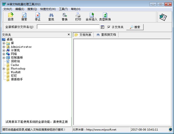 米普文档批量处理工具(word文档批量操作软件) 是一款特别针对于Office办公软件中的Word文档进行批量处理的软件。word处理起来很容易,但是工作中有多个文档该怎么办呢?文件多了会让人整理的头疼,这款米普文档批量处理工具是一款可以辅助word文档批量操作的查找、替换、打印、合并、拷贝、类型转换、格式、页眉页脚、加密、标密等一系列的操作,你只需要在软件里轻轻设置一次,就可以很快速的达到你想要的效果!有了这款辅助工具可以大大提高办公人士的工作效率,能够节省下来很多时间,喜欢的话就快来下载试试看吧!