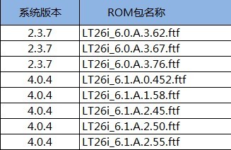 系统版本 ROM包名称2.3.7LT26i_6.0A3.62.ftf