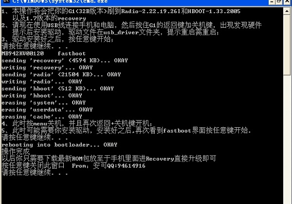 3、cmd会运行一些东西,最后输入platform-tools[空格]flash[空格]recovery[空格]1.img 成功后会有提示。