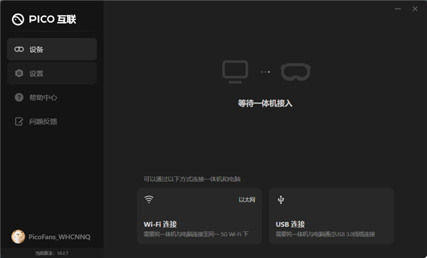 使用起来非常简单,用户只需要在电脑中下载一个SteamVR、PICO互联,并登录你的账号,支持以太网和USB两种连接方式,连接之后我们即可在设置中游戏清晰度、码率、音频、桌面显示。