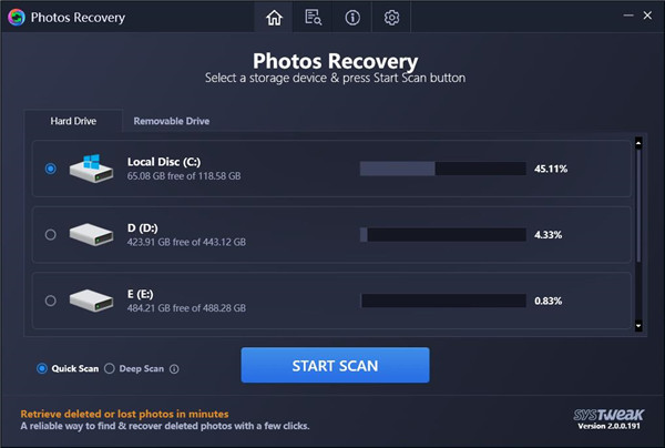 在电脑上操作的时候,经常不小心就会删掉了一些重要的文件和图片数据,需要用的时候怎么都找不回来,今天带来Systweak Photos Recovery,它是一款专业的照片恢复软件,能够帮助用户对电脑进行快速恢复。软件允许您预览和恢复丢失,删除和无法访问的照片视频文件,并且具有相对较高的光恢复成功率,易于使用,不需要专业技能。Systweak Photos Recovery帮助用户从磁盘分区或者其他存储设备中搜索丢失或者损坏的图像文件,支持主流的图片格式,只需按照向导步骤,几步即可完成修复,具备了快速扫描和深度扫描模式,满足不同的需求,快速加载并恢复。有需要的用户欢迎下载体验。