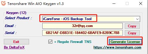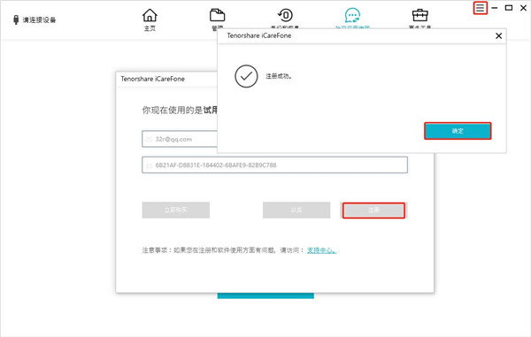 7、双击打开Tenorshare iCareFone软件,点击红色选框下的注册,将注册机中的注册码和邮箱复制到软件对应位置,点击注册