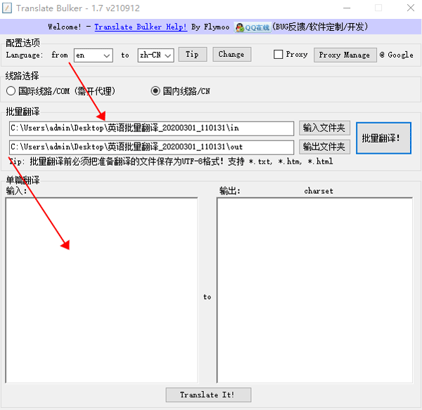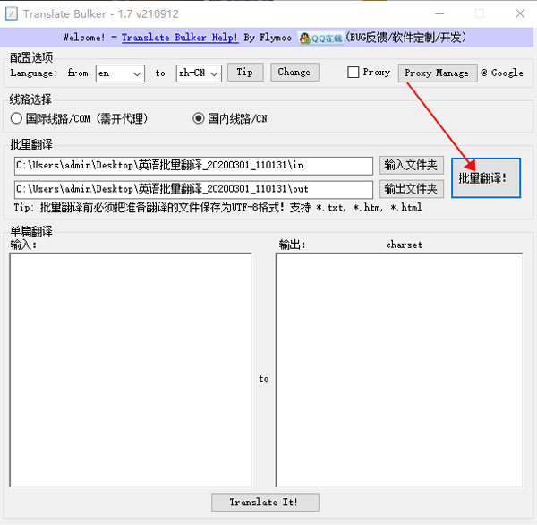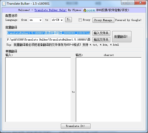 Translate Bulker是一款功能强大好用的,可以实现对各种语言文件翻译的软件。软件支持批量翻译也支持单篇翻译,还支持多国语言互相翻译批量翻译前必须把准备翻译的文件保存为UTF-8格式,支持*.txt、*htm、*html等格式。软件应用原理是:调用Google Translate API批量把输入文件夹(IN)的所有文本文档翻译好,然后保存到输出文件夹(OUT)里,用户在输出文件夹里就可以找到已经翻译好的文本了。