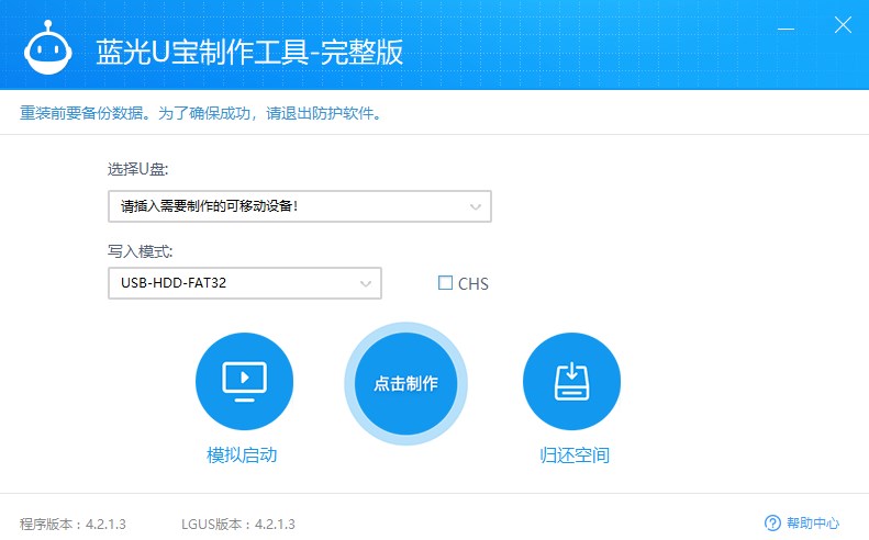 蓝光U宝制作工具官方版是一款目前市面上最简单、最好用的u盘启动盘制作工具,是一款专门为了电脑操作系统重装而生的系统重装软件,蓝光U宝制作工具只需一键就可以将您的U盘制作成系统启动盘,采用一键安装的傻瓜模式,真正实现一键u盘装系统,让用户可以更好的完成系统重装,而且,小编给大家带来的是完整版,完整版制作的U盘启动盘默认支持BIOS+UEFI双启动,兼容机型更多,软件界面采用简约、时尚的风格,自有品牌形象创意卡通设计,让用户在使用产品的同时也能享受产品设计的风格;同时,完整版的蓝光U宝制作工具默认内置了部分装机工具和软件支持装机工具,蓝光U宝制作工具是由蓝光网络公司开发的系统安全辅助工具,可安装的系统包括xp、win7、win8/8.1、win10等,可识别的系统文件格式包括ISO、GHO、WIM、ESD、光盘等。在系统重装之外,还具备引导修复,硬盘分区,清除密码,磁盘检测,理顺盘符等,采用USB2.0高速接口,持久耐用,支持多种兼容,读写速度开成快,所有的操作均有引导,即使是新手也能快速使用本产品。