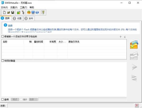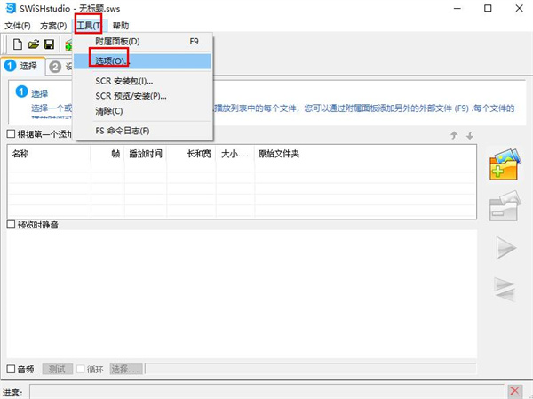 一、选择 选择一个或多个flash或图像文件以组成播放列表,播放列表中的每个文件你可以通过附属面板添加另外的外部文件(F9),每个文件的播放时间可以通过点击“工具”—“选项”进行编辑