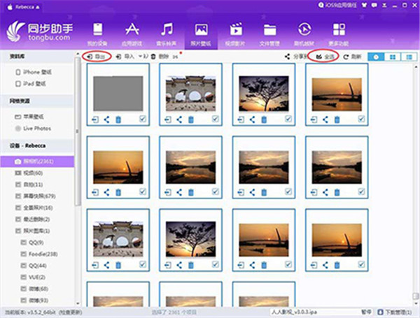 2、选择你想要备份的照片,可全选也可以单独勾选,然后点击【导出】将照片导出到本地电脑中保存。
