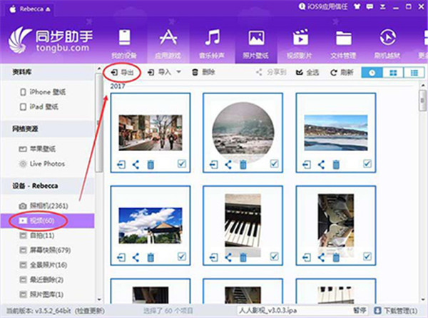 3、如果要导出视频,选择菜单栏里的【视频】,勾选要备份的数据进行【导出】即可。