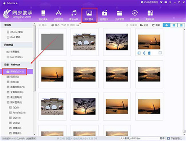 1、运行同步推并用数据线连接设备到电脑。切换到【照片壁纸】界面,选择【照相机】。