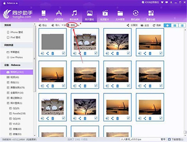 4、确保照片和视频已经备份到本地电脑中,就可以在助手里进行删除操作,同时手机里的照片和视频也会一起删除,为手机腾空间,当然你也可以直接在手机上进行删除操作。