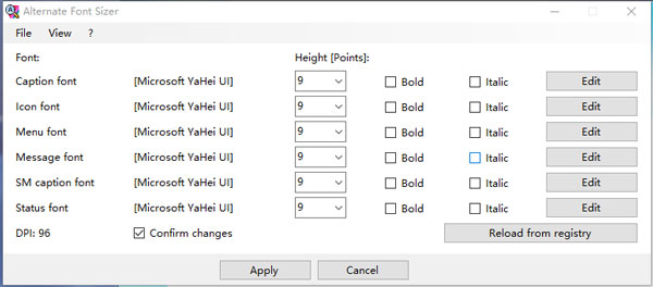 由于windows的系统文字的字体大小都是保存在注册表中的,Alternate Font Sizer通过读取注册表中的对应注册表项来获取这些值,并显示在软件界面中。这样一来,你只需要修改这些值就可以改变系统文字的大小,各种图标也会维持原来的大小。由于无需改变dpi,不改变dpi也就不会影响到图标的显示,图标不会因为受到dpi改变的影响进行放大,避免导致图标模糊和出现色块。