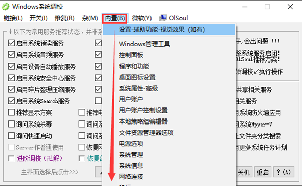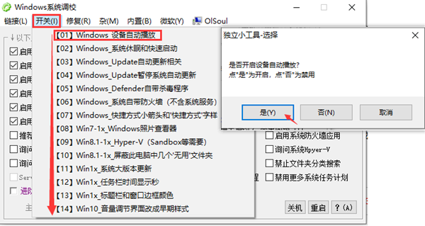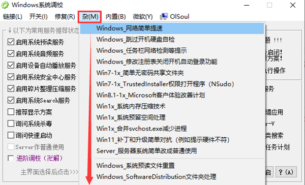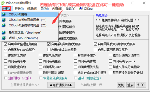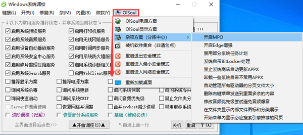 OlSoul是一款功能强大Windows系统调校软件,内置无线网络,服务器,打印机等多项功能一键式启用,设备自动播放、系统休眠和快速启动等内部功能一键开关,众多具体调校功能多达几十项,帮助用户方便快捷的启动电脑中实用但难寻的新功能、小功能,减少用户搜寻查找的时间,实现对系统进行更好的调试和优化设置。