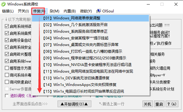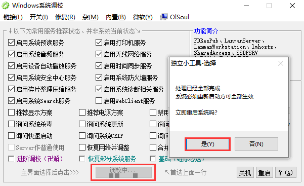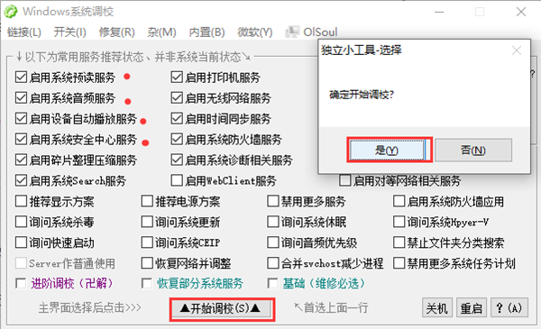 1、怎么使用OISoul调校系统? 进入软件页面勾选想要进行调试的服务项目,点击下方“开始调校”,选择“是”。