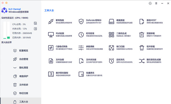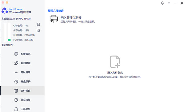 众所周知,Windows自带的设备管理器虽然功能该有的都有,但是区别于专业的windows管理器而言还是有很大一段差距。为了让用户可以更好地管理自己的电脑,此次小编带来的是formal windows超级管理器,这是由科利特尔Collithel团队开发而成的计算机参数查看和计算机管理辅助软件,区别于同类软件而言,这款windows超级管理器拥有许多优势所在。首先软件完全免费,操作也极其简单,详细的功能面板与易于操作的方式,受到了许多朋友的青睐。其次它功能齐全,包含了配置概览、自启管理、隐私清理、磁盘保护、文件粉碎、特征扫描等多种亮点,可让你对于自己的电脑硬件信息快速掌握,更好的配置自己的电脑。甚至最为一提的当属其小巧的体积,虽然体积小巧,但是五脏俱全,同时没有任何流氓广告,也是其最大的优势之一。简而言之,如果你想更好的管理电脑,不论是删除顽固的文件、卸载麻烦的程序还是更好的掌握电脑信息,那么你一定不要错过这款windows超级管理器,欢迎感兴趣的朋友免费下载体验。