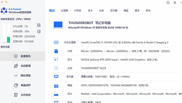 其中实时性能展示包括CPU占用、内存占用、可用内存和已用内存实时展示,配置概览包括整台电脑概览、处理器、内存条、显卡、主板、显示器、硬盘、网卡、声卡、以及更多的基本信息。
